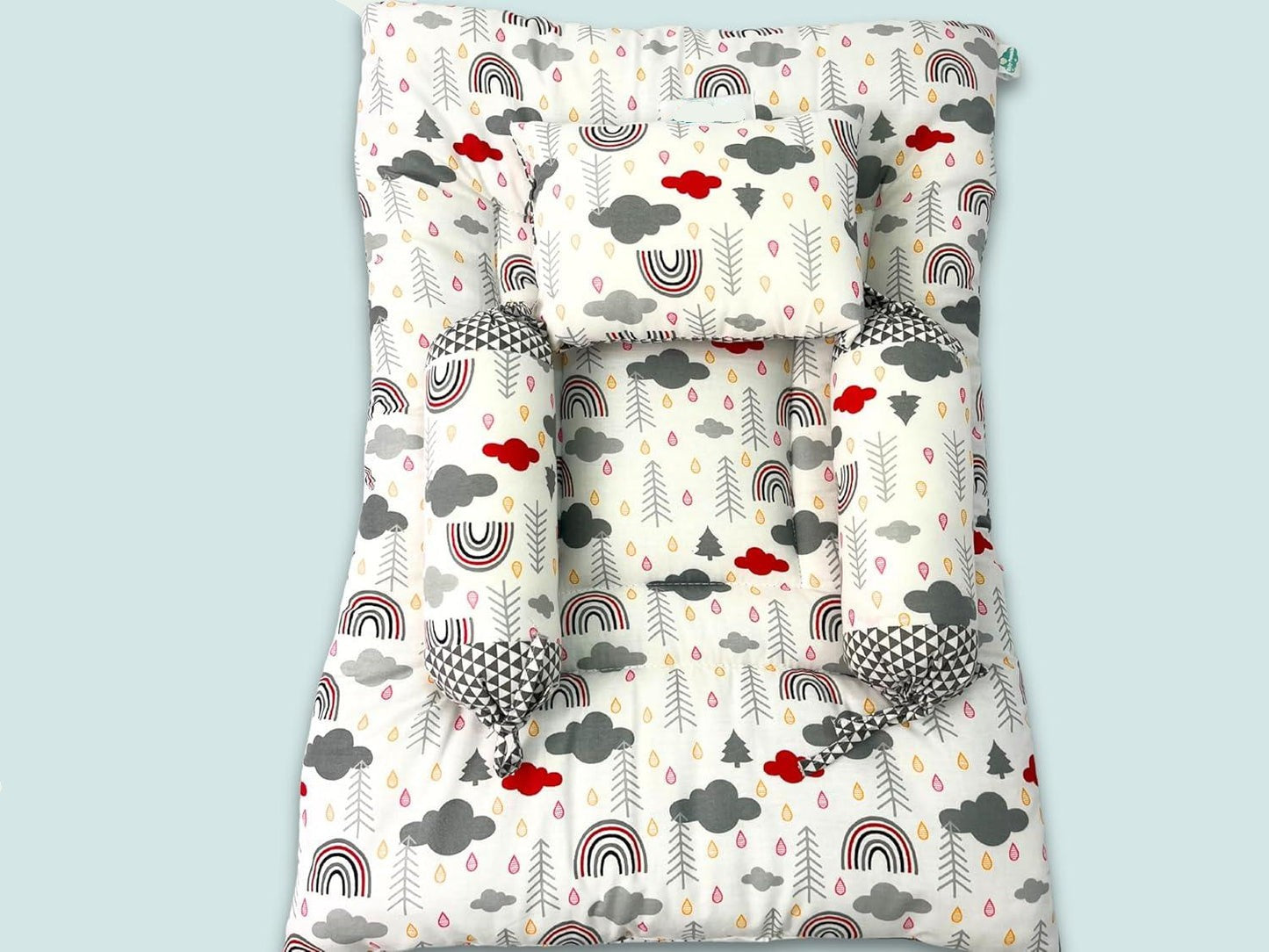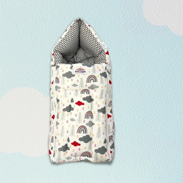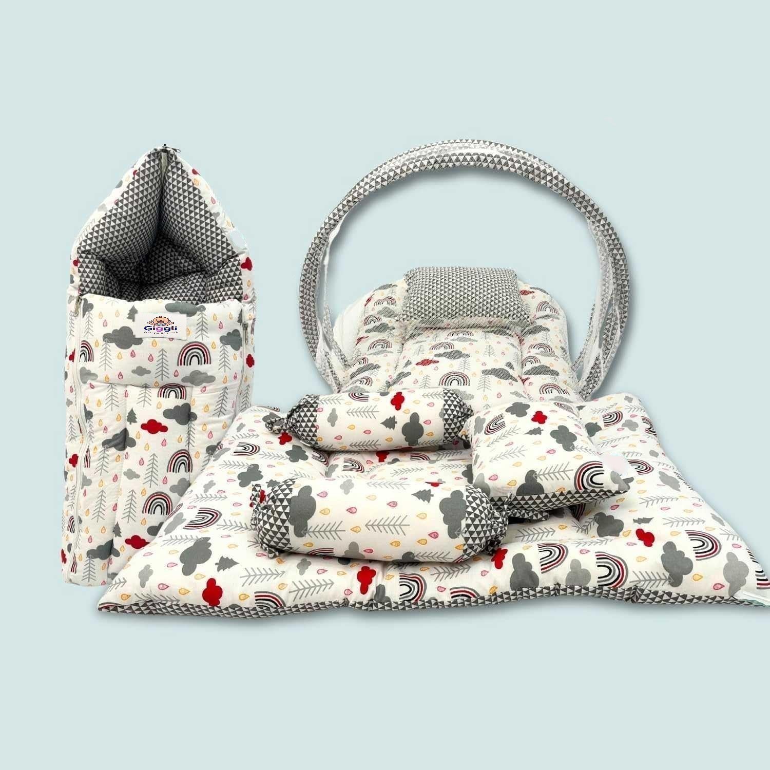 Give your baby the gift of uninterrupted, cozy sleep with the Giggli 5-in-1 Premium Baby Bedding Set – designed with love, safety, and functionality in mind. Featuring a charming cloud-and-rainbow print, this all-in-one set includes a soft mattress, breathable mosquito net, comfy pillow, supportive bolsters, and a convertible carry nest for easy transport.