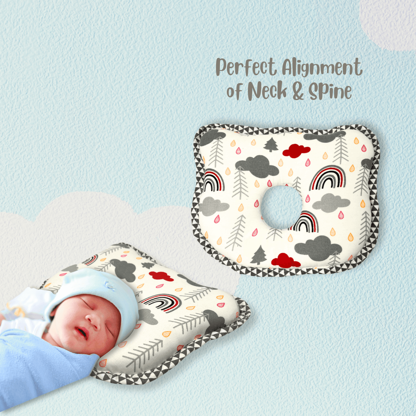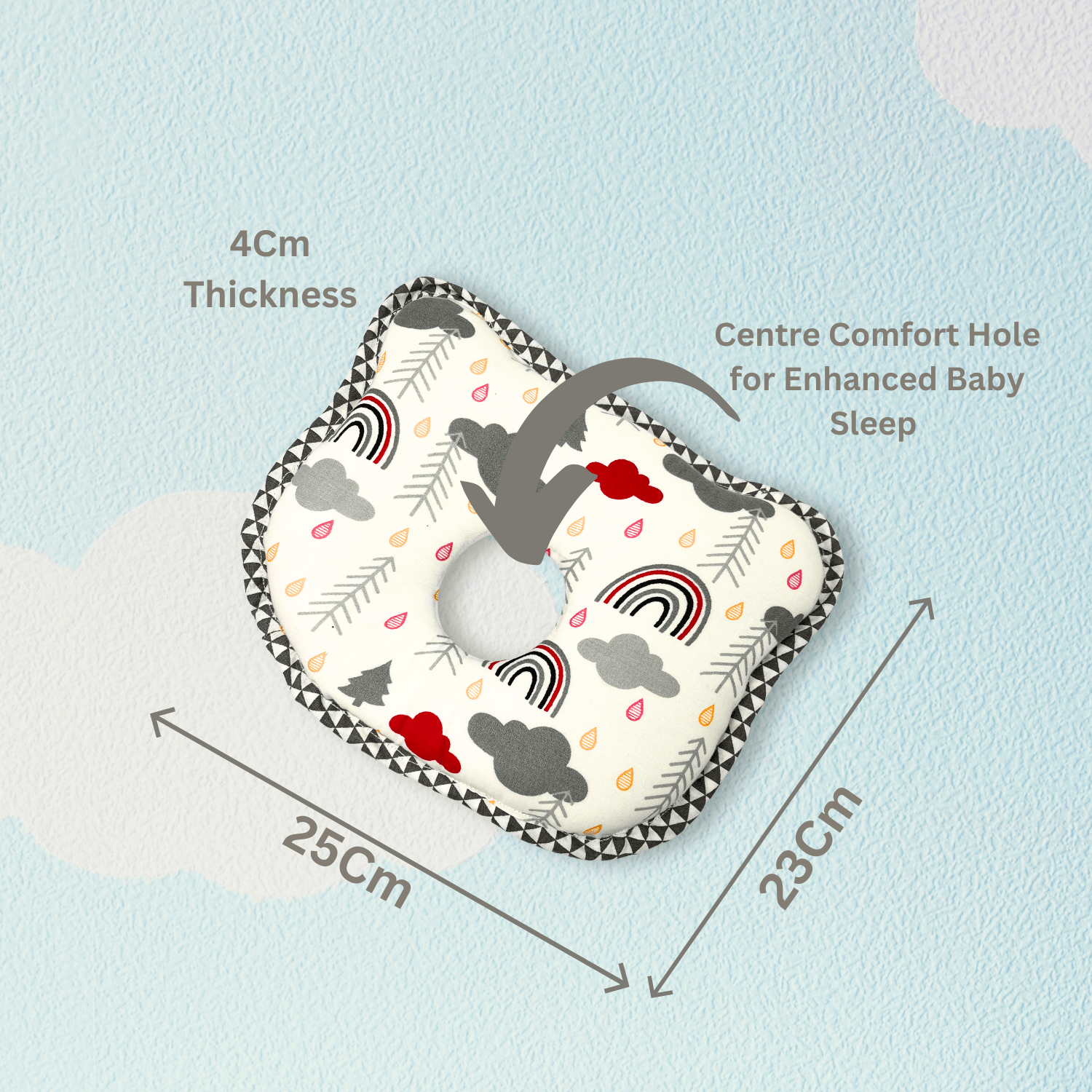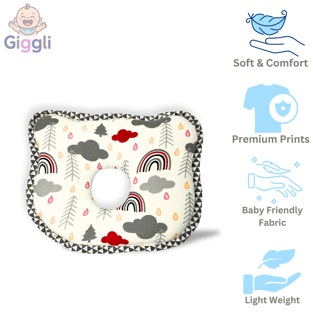Enhance your baby’s sleep with the Giggli™ Baby Sleep Pillow, designed for ultimate comfort and safety. Featuring a unique 4cm thickness and a centre comfort hole for enhanced sleep support, this lightweight pillow (25x23cm) is crafted with baby-friendly fabric. The premium print showcases a delightful rainbow, cloud, and tree design, ensuring a soft and cozy experience. Perfect for your little one’s nursery!